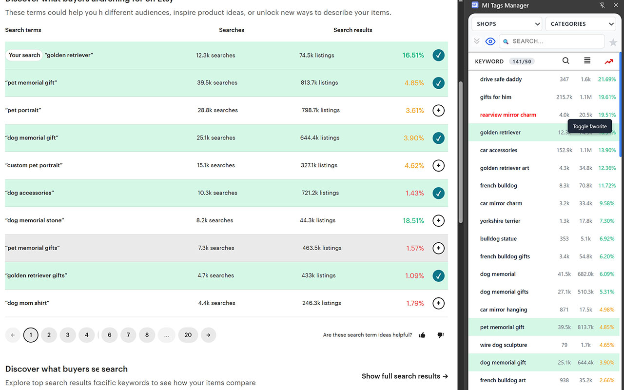 Etsy shows tags as an inconvenient list all together without data. The extension transforms them into a convenient column with current statistics.