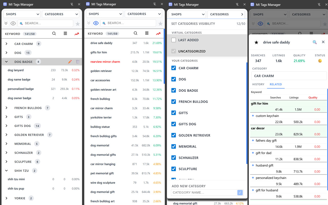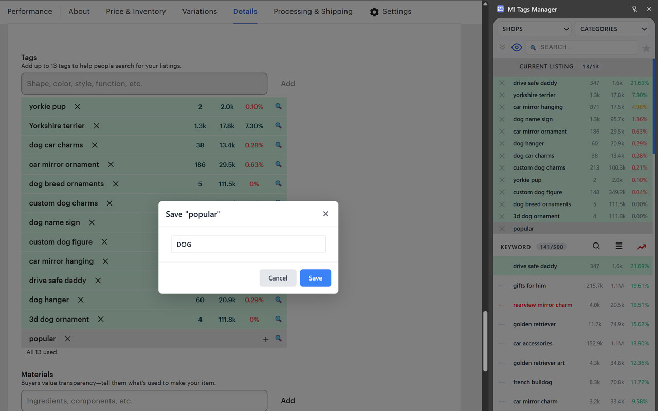 Etsy shows Targeted Keywords on the ads page, but to check their statistics on Marketplace Insights you have to constantly switch between tabs. Select a keyword with your mouse — and immediately add it as a tag or open in MI.