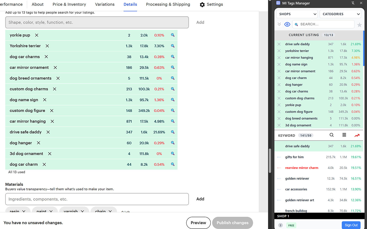Etsy shows Targeted Keywords on the ads page, but to check their statistics on Marketplace Insights you have to constantly switch between tabs. Select a keyword with your mouse — and immediately add it as a tag or open in MI.